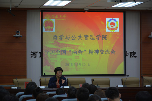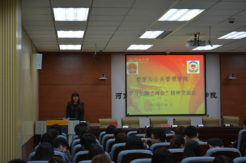 随后,五位研究生党员代表结合大学生自身进行了“两会”精神经验交流。刘旸针对“两会十大关键词”解读了2015年全国两会政府工作报告并结合“经济新常态”观点详细阐释了两会政府报告精神。他认为,稳增长、调结构、简政权、重民生是本次政府报告的核心所在。韩阳阳则从必要性和重要性解读了全国人大常委会工作报告并突出解释修改立法法的目的。结合报告,修改立法法是认真贯彻落实党中央决策部署的需要,更是完善立法制度的要求,其重要性不言而喻。朱大帅则结合“四个全面”详细分析了张高丽、赵乐际参加河南代表团讲话精神,并以郑州航空港经济综合实验区的发展与一带一路区域发展为例分析了河南省发展的十大机遇。冯超在讲解“李克强总理答记者问”时,重点分析了台湾、中国搭便车和中美关系等问题,充分展现了彰显大国总理的民本情怀。最后房圣康带领大家聚焦“河南团关注的热点”,本次两会河南团不仅仅关注本地长远发展的战略问题,更关注全面深化改革、促进农村农业发展,推进教育、文化、卫生等社会主义建设以及国家筹建亚投行等关系国计民生的大事,展示了我中原儿女宽阔的胸襟与历史担当。