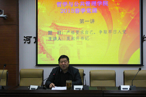 4月7日晚,我院在院三楼大会议室举办2015年春季党课培训,院党委书记莫起升围绕“严格要求自己,争取早日入党”主题开始了党课培训的第一讲内容。