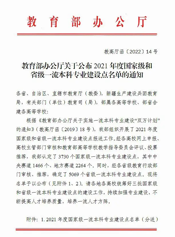 近日,教育部办公厅公布了《2021 年度国家级和省级一流本科专业建设点名单》(教高厅函〔2022〕14 号),我院劳动与社会保障专业入选国家级一流本科专业建设点,社会工作专业入选省级一流本科专业建设点。