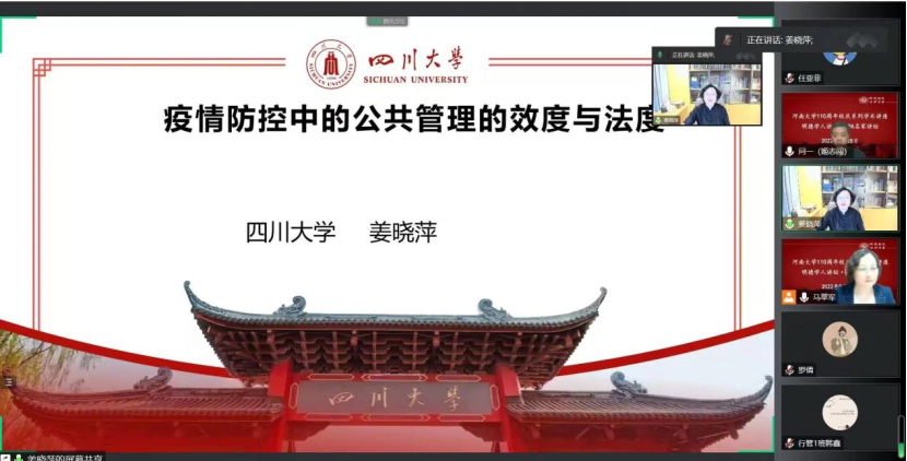 110周年校庆哲管院系列学术讲座之明德学人讲坛系列第14场举行。应我院邀请,四川大学姜晓萍教授在线作了题为《疫情防控中公共管理的效度和法度》的学术报告。此次讲座由我院院长姬志闯教授主持,公共管理及相关学科的师生通过线上的方式共同参与了此次讲座。