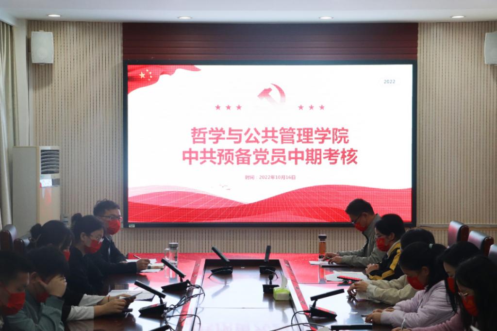 会议室举行预备党员中期述职考评会。2022年5月发展的38名预备党员全员参加,各党支部书记和入党介绍人担任评委。
