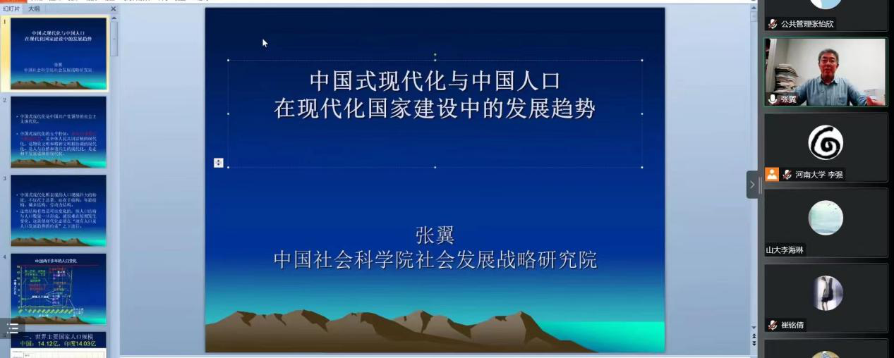 张翼教授应邀在线上为我院师生做题为《中国式现代化与人口发展》的学术报告。本次讲座由我院李强副教授主持,我院全体师生通过线上的方式共同参与了此次讲座。