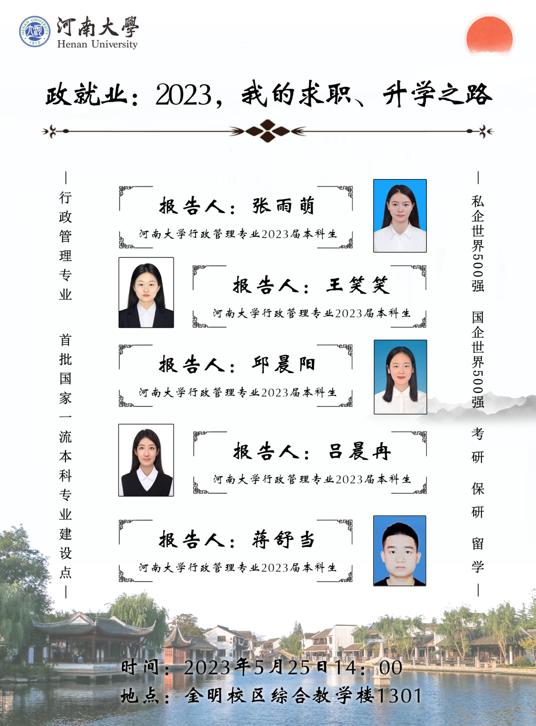 为加强行政管理国家一流本科专业建设,切实帮助学生清晰了解目前就业、升学形势,我院行政管理系于综合楼1301举办“政就业:2023,我的求职、升学之路”经验交流会,公共管理类本科生参加,2023届五位本科毕业生受邀分享,会议由行政管理系主任刘辉主持。
