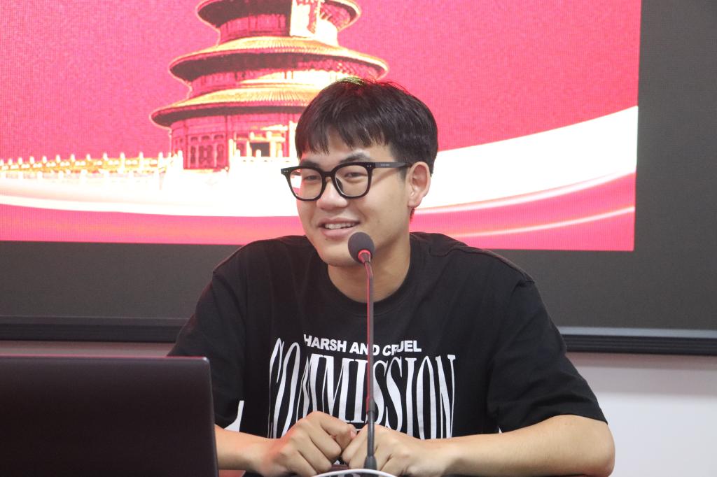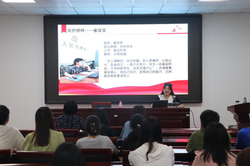 用心讲故事,润物细无声。支部成员依次分享了自己身边榜样故事。杜红艳同志以“不求尽如人意,但求无愧于心”为题宣讲关于一名基层村官的故事。作为一名基层村官,她坚持做点滴事,做踏实人,用自己学到的知识和能力,己所能及帮助更多的人。苏子乐同志以“安静的宿管阿姨”为题,讲述了宿管阿姨温柔的秉性、体贴的关怀和不求回报的付出,他说“宿管阿姨会在允许范围内给我们行最大方便;会主动帮助,解决学生的困难;会在炎炎夏日为学生送上清凉,这些不求回报的付出值得我们每一位同志学习”。安骋昊以自己的父母、身边的老师、学长学姐和同学为榜样,为大家分享了自己周围的榜样力量,用榜样的力量感召大家力所能及的把身边每一件小事做好,努力成为自己的榜样。秦娜分享了自己家乡的90后大学生村支书。她分享的姚书记笃行实干,为村民办实事。她说:“从姚书记身上我看到了作为大学生和当代青年之于社会的价值,我们要学习的不是做的事情,而是她积极作为无私奉献的精神,这是一个有可为的时代,只要我们肯吃苦肯努力就一定能够有所为”。