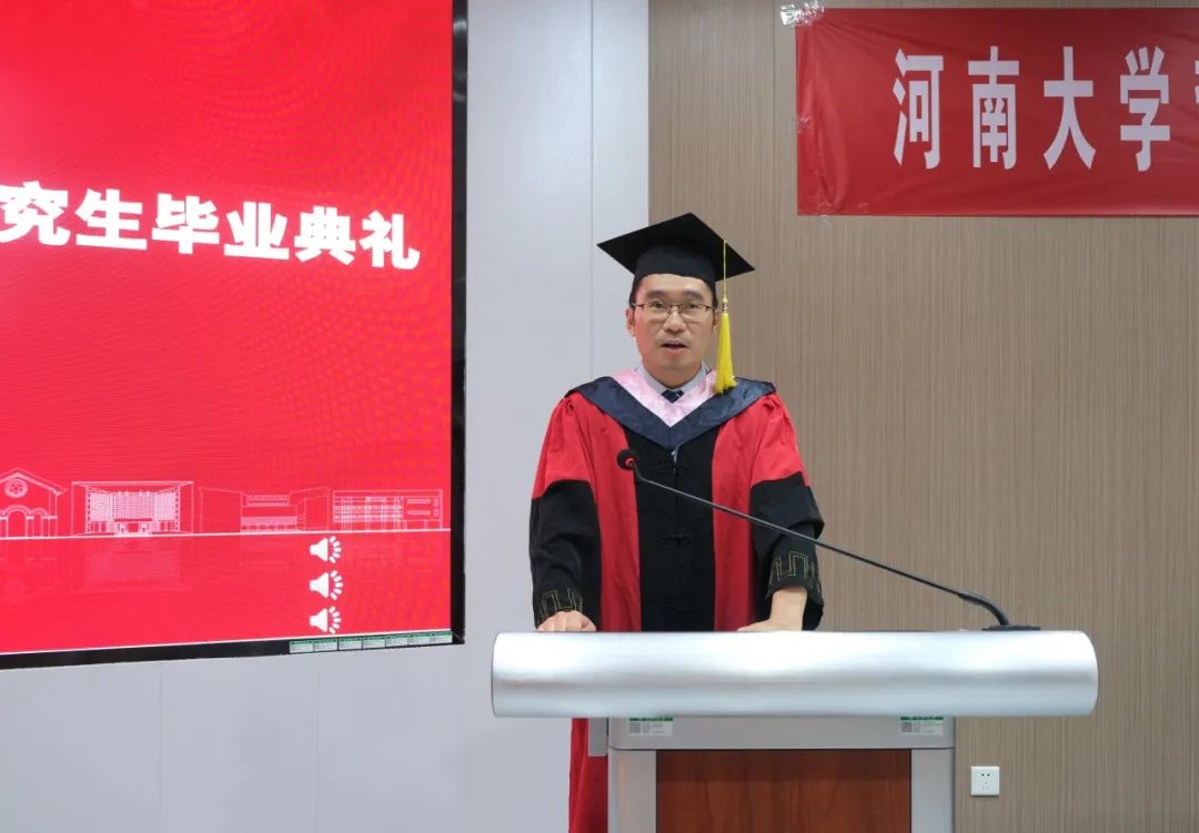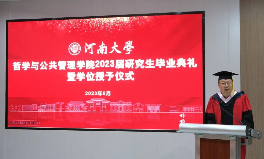党委书记党鸿军向2023届毕业生表示热烈的祝贺并提出四点希望,与同学们共勉:第一,希望同学们融入时代洪流,做担当奉献者。积极传承河大精神、哲管精神,激发强国有我的青春激情,积极投身中国式现代化建设,在民族复兴伟业中勇当先锋队、突击队,展现青春的朝气、锐气。第二,希望同学们拥抱时代变化,做积极创新者。鼓励同学们敢于打破传统思维,主动拥抱变化,立足新环境,研究新情况,解决新问题,在不断突破中撰写个人发展的“创新点”。第三,希望同学们无惧困难挑战,做勇敢追光者。发扬论文写作精神,学会把挫折当作一种人生的考验,在挑战中前行,在困难中崛起,在奋斗中成长,成为勇于追光之人。第四,希望同学们保持个人定力,做久久为功者。懂得拒绝诱惑,能够坚守初心,以绣花般的细心、耐心、巧心,狠下功夫,刻苦钻研,实现自我的高质量发展。
