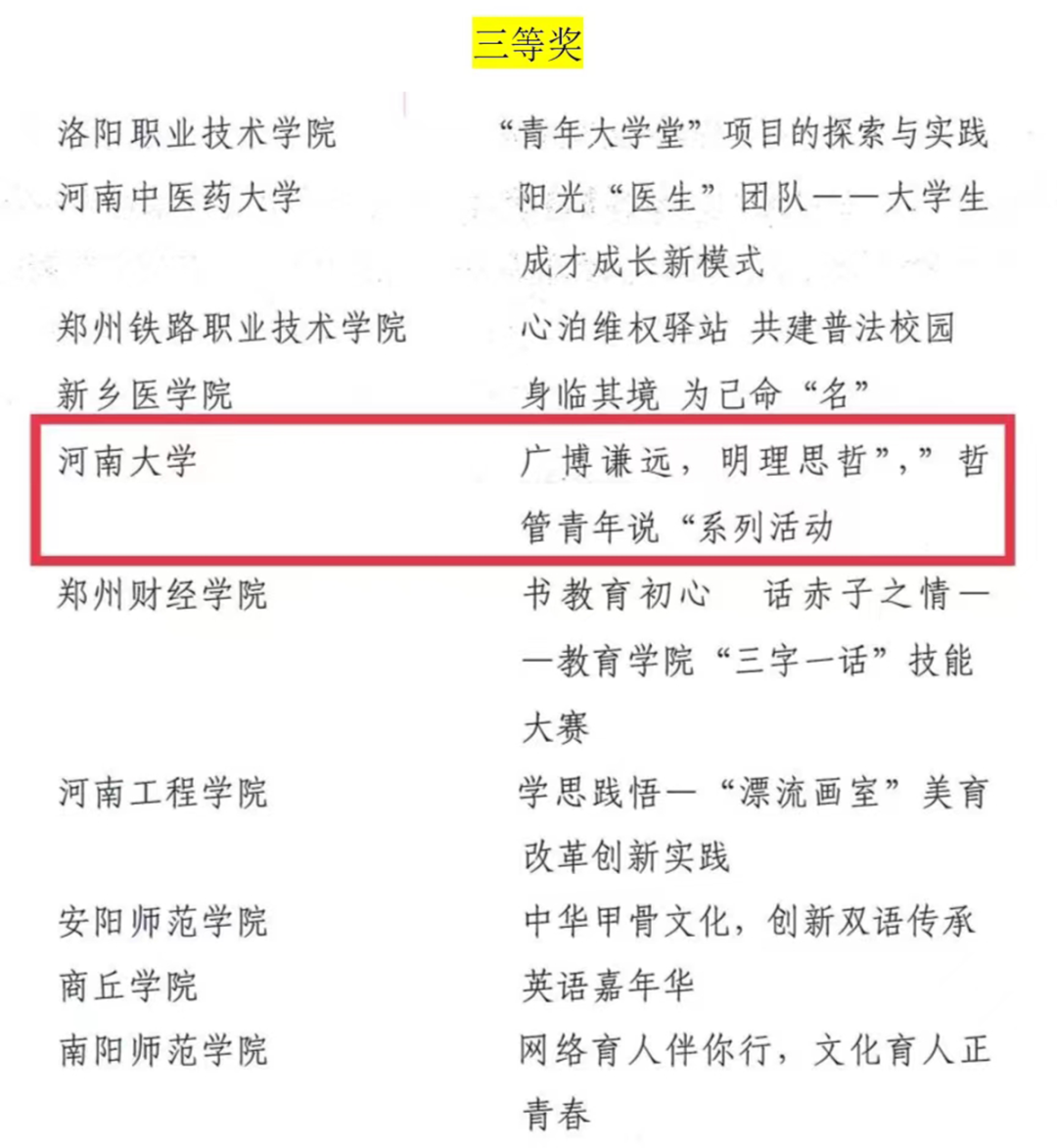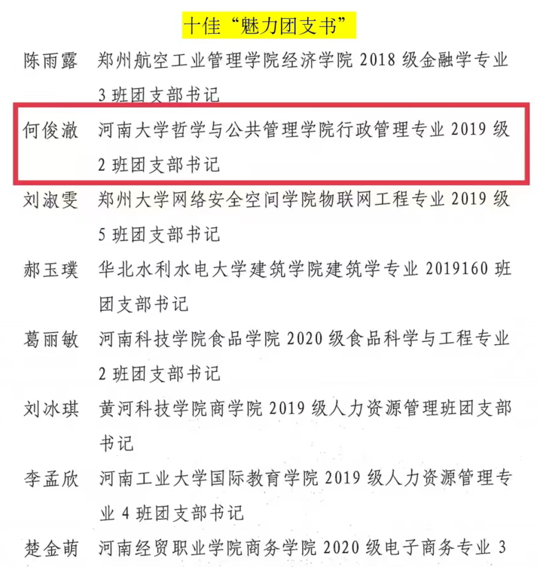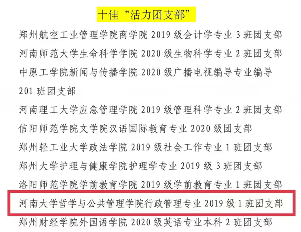 近日,共青团河南省委发布了2022年度“活力杯”河南学校共青团基层基础工作大赛获奖名单。我院“承前启后中国年,听说读写提能力”新年主题系列活动和“广博谦远,明理思哲”“哲管青年说”系列活动荣获共青团工作项目大赛一、三等奖,行政管理专业2019级1班团支部获十佳“活力团支部”奖项,行政管理专业2019级2班何俊澈获十佳“魅力团支书”称号。