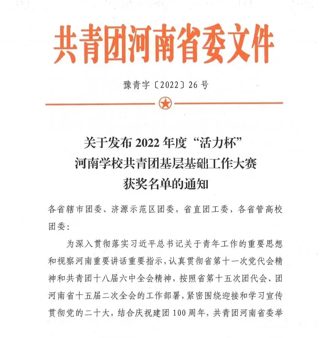 此次表彰是对我院共青团工作的肯定和认可,进一步鼓舞全院师生贯彻落实习近平总书记关于青年工作重要思想和视察河南重要讲话重要指示,继续跟党走、奋进新征程,持续巩固共青团的基础性战略地位,争取以优异的成绩迎接党的二十大胜利召开。