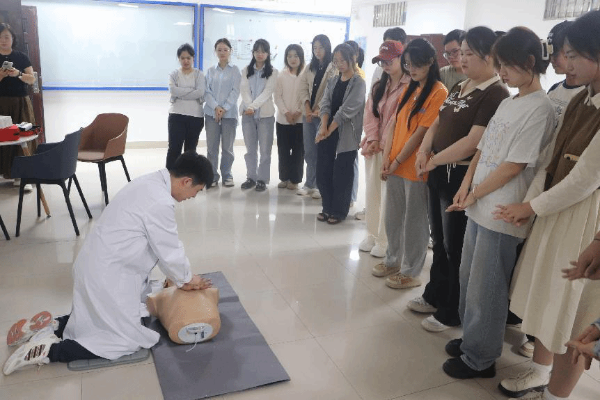 讲解结束后,为进一步提高培训效果,樊航医师与朱琳琳主管护师带领同学们利用人体模型分组进行了实操演练。在深度模拟实际情形的基础上,医务人员们一丝不苟地纠正同学们各环节的姿势、手法,确保动作标准、力度到位,以及AED的使用规范。现场同学们兴致高昂,专心致志地完成急救动作,直言学到了救人的真本事,受益匪浅。