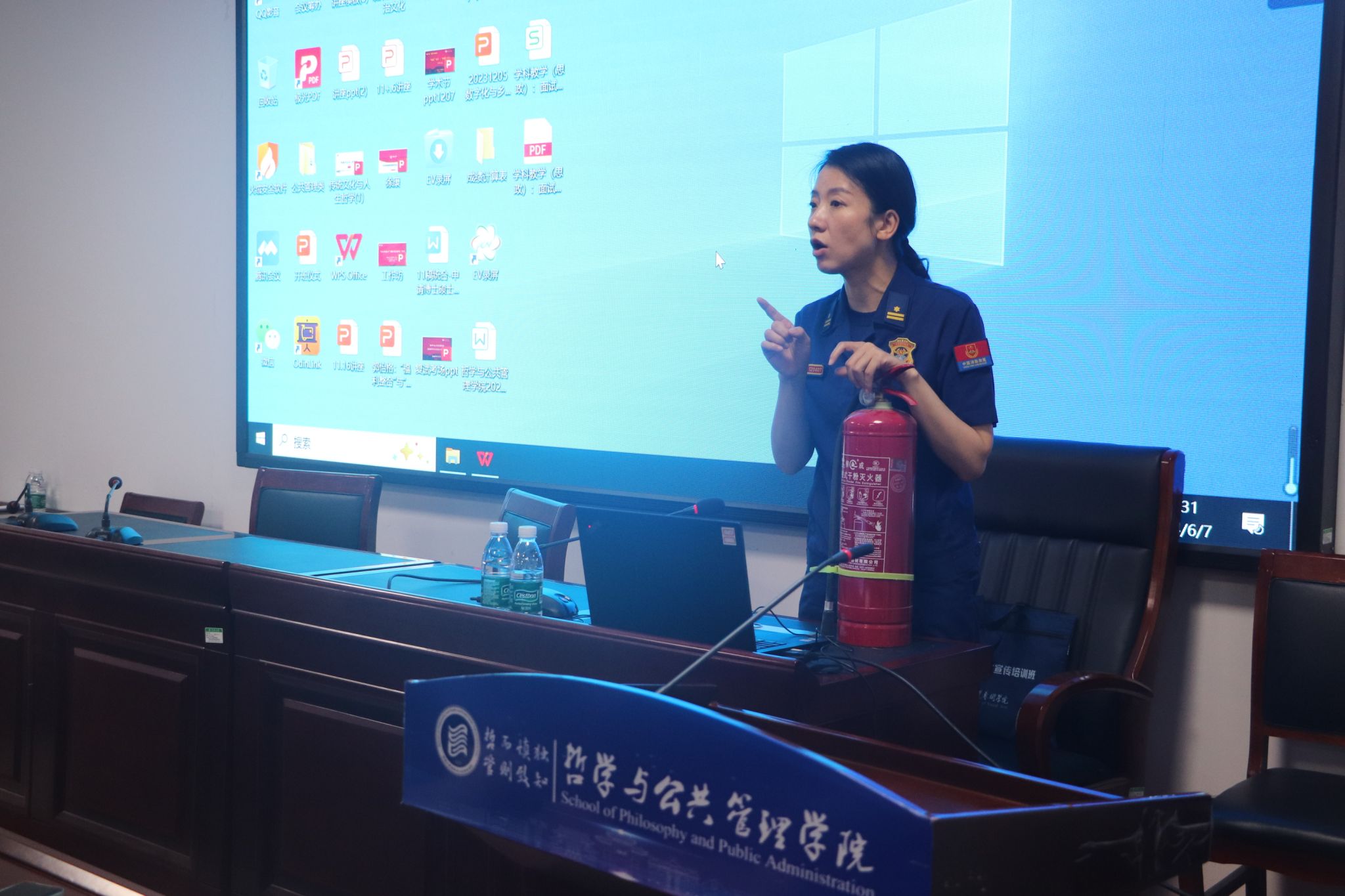 还组织了参会师生进行消防安全和灭火器材的规范使用演练。王芳为大家详细讲解了不同种类灭火器适用的火灾情况及使用方法,演示了消火栓与水带、水枪头的连接及出水灭火等具体操作步骤。与会师生分组上阵、逐一体验,全过程演练与灭火实际操作,掌握了正确使用灭火器材的方法和技术要领。